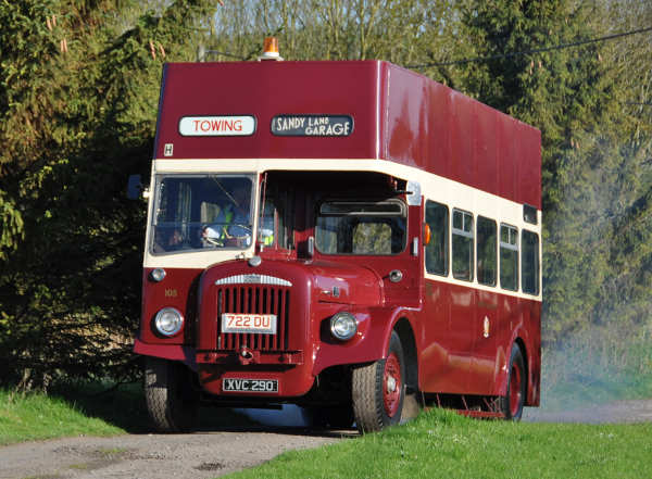 XVC290 is a Daimler CVG6 cut down after hitting a low bridge in 1960s and then used by Coventry CT for tow truck use. Withdrawn by WMPTE, it is part of the Roger Burdett collection and used as yard shunter and tree lopper. Access to interior is by rear door - access to roof is by any convenient ladder.