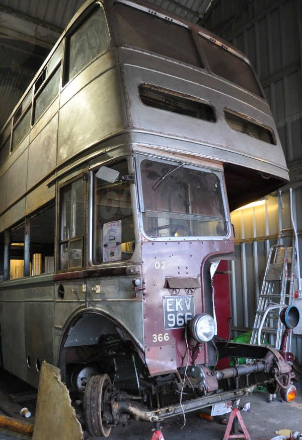 A picture of preserved Coventry 366, EKV966, under restoration, a Daimler CWA6 dating from 1944, rebodied by Roe in 1951.