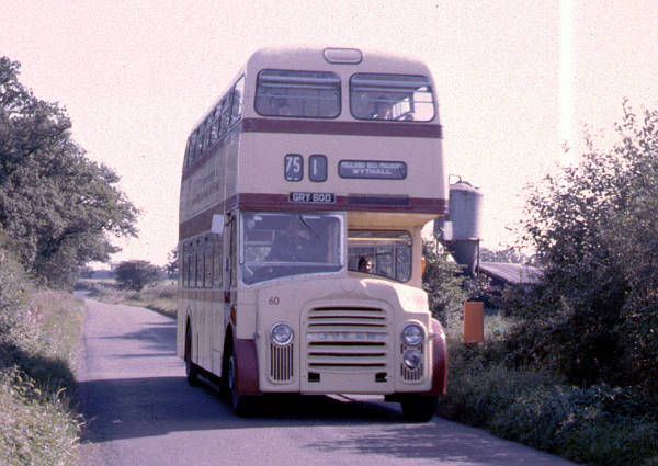 GRY60D, new in 1966 is Leicester 60, a Leyland Titan PD3A/1 with Park Royal 74 seat body.