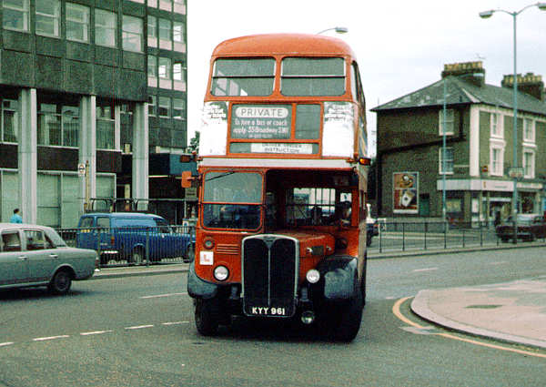 LT AEC Regent III RT3232, KYY961, with Weymann H30/26R body is seen in use as a driver's training vehicle near Chiswick garage.