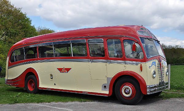 A colour picture of Lymers URE281 - the preserved Harrington-bodied AEC Regal III dating from 1950, in which you can just see the start of the dorsal fin.