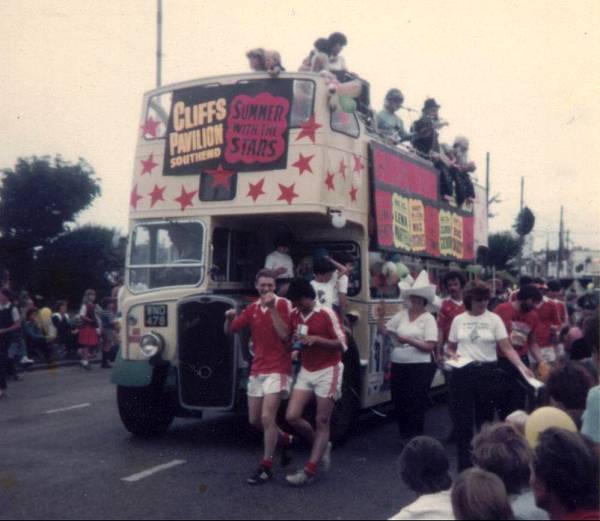 Eastern National's open top KSWs have formed the basis of floats in Southend Carnival on a number of occasions. In this undated shot, 2380, WNO478, promotes the Cliffs Pavilion's "Summer with the Stars".