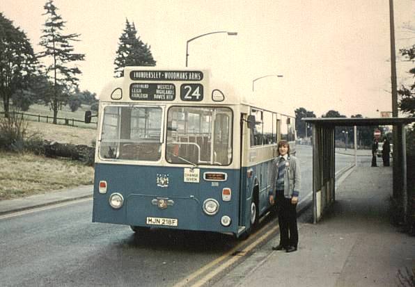 Entering service in 1968, Southend had four of these long Leopards with somewhat angular East Lancs bodies, the most distinctive feature of which was probably their huge Ford Anglia style rear windows. This is the first known photo of Peter at work, at Leigh Station with the last of the batch, 218, MJN218F, with an evening peak commuter short on the 24.
