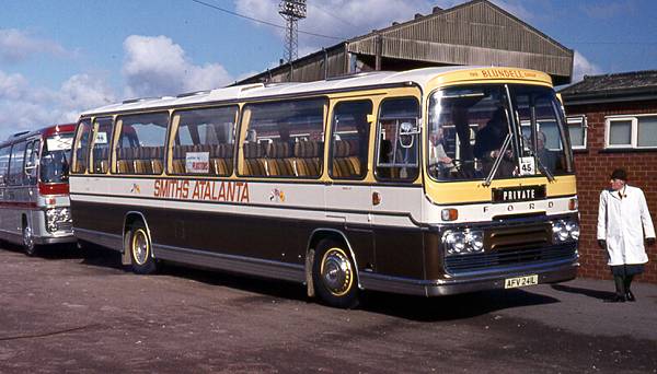 Seen in Wigan at the start of the National Coach Rally was AFV241L, a Ford R226 with a Plaxton Panorama Elite III C53F body of Smiths Atalanta, Blackpool.