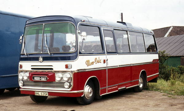 Moor-Dale Coaches, Newcastle, BNL635K, a Bedford VAS5 built in 1972 with Plaxton Panorama III C29F bodywork. Actually new to the Curtis part of the group but seen here with Moor-Dale fleetname in corporate colours.