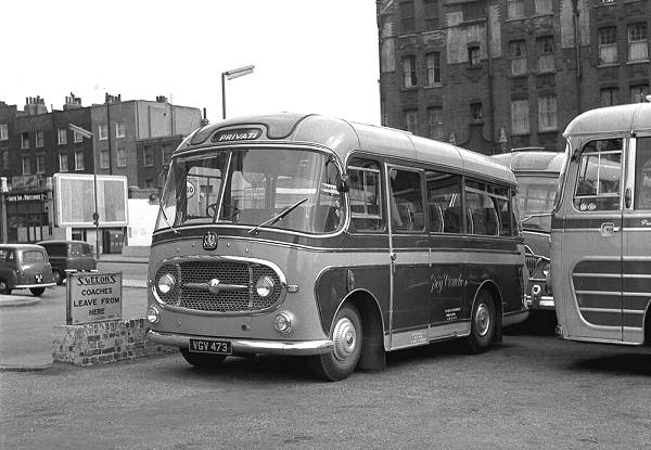 Morley, West Row VGV473, a Bedford J2SZ10 with Plaxton Embassy C18F body at King’s Cross Coach Station, Pentonville Road.