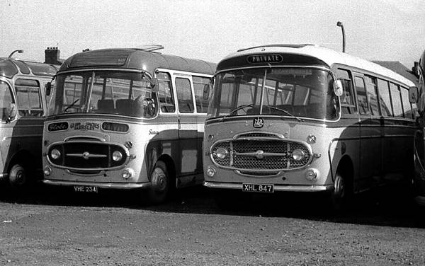 The coach to the left, JJM3, is an Embassy bodied Bedford SB5 of Harry Cawthorne (Majestic), Darton which has the glazed quarterlights and front dome with roof level destination display which was an option.