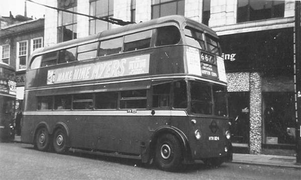 London Transport BUT / Metro-Cammell 1948 Q1 Class trolleybus 1824, HYM824, of Fulwell Depot (FW) heading for Hampton Court. Behind is the more common and older trolleybus on the 666 Edgware route.