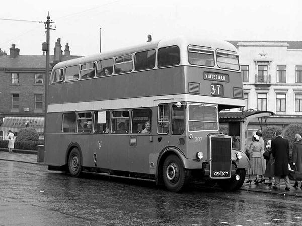 Bury 207, GEN207, was one of twenty Leyland PD3/6 Titans with Weymann H41/32RD bodies new in 1958 and is seen in Bury the same year.