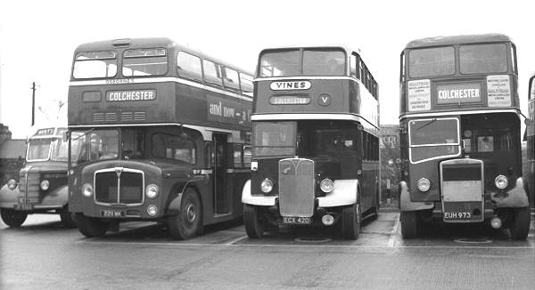 In the middle is an AEC Regent III with Northern Coachbuilders L55R body, ECX420, which started life with the Huddersfield Joint Committee and passed in 1963 into the small fleet of Vines of Great Bromley. It was in turn sold later in the year this picture was taken to Silver City of Harlow.