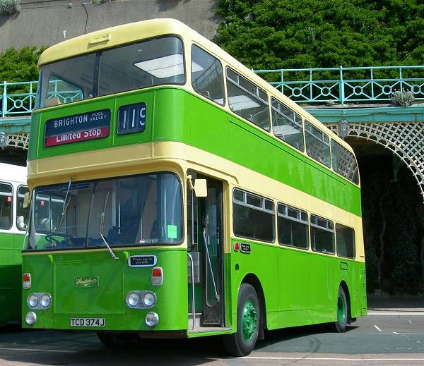 Preserved ex-Southdown 374, TCD374J, is a Daimler Fleetline CRG6LX30, fitted with a Northern Counties H40/31F body. 374 was new in September 1970 to Worthing depot, and is seen here at the Brighton & Hove 75th aniversary rally.
