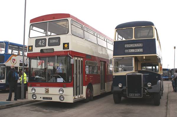 Ten years seperate these two Leylands but they look light years apart in styling and concept. Nearest the camera is Barrow 170, CEO957, a 1958 Leyland Titan PD2/40 with Park Royal bodywork. The Leyland Atlantean is Manchester 1001, HVM901F, a 1968 model with the prototype Mancunian body for one man operation.