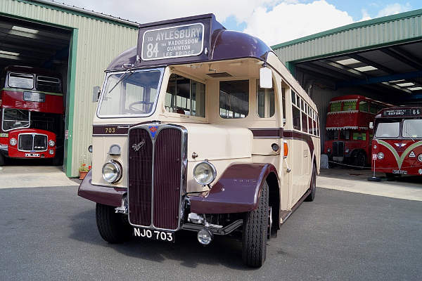 City of Oxford AEC Regal 703, NJO703, has Willowbrook dual purpose 32 seat body and dates from 1949. It carries a reversed cream and maroon livery and is seen at the Oxford Bus Museum.