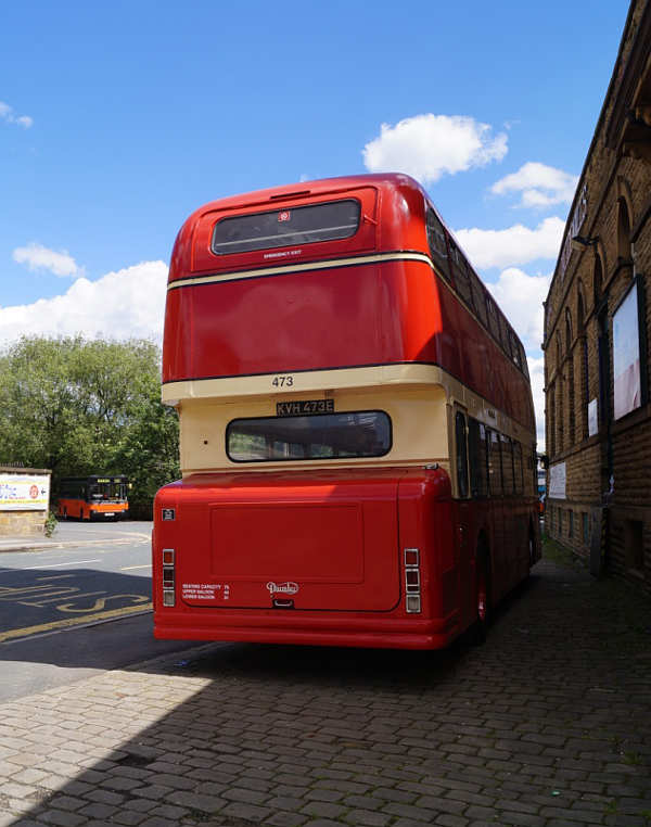 Huddersfield's first Daimler Fleetlines date from 1967, Roe bodied examples used to close the trolleybus system. This rear view of 473, KVH473E, shows off its rounded dome at the Keighley Bus Museum open day.