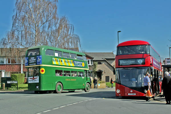RT4779, OLD566, on the special bus service run in connection with the Safeguard Coaches depot Open Day on 29th March 2014, heads into Guildford from the depot. The fourth vehicle on the service "Borismaster" LT80 LTZ1080 waiting on the opposite side of the road provides a contrast between standard London buses of the 1950s and 2010s.