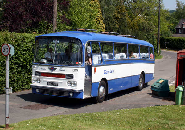 900SAF is an A.E.C. 2U3RA Reliance with a 33' long Harrington Grenadier C43F body equipped with two tables. It is seen at Plaxtol having just operated a journey on route 68 from Sevenoaks Bus Station on the occasion of a London Transport Country Area Running Day. It was new in May 1963 to Hawkey, Newquay and later passed to Camden Coaches, Sevenoaks.
