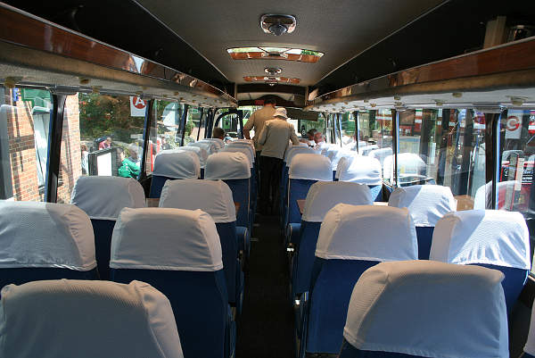An interior view of 900SAF looking towards the front on its return to Sevenoaks Bus Station from Plaxtol. It is an A.E.C. 2U3RA Reliance with a 33' long Harrington Grenadier C43F body equipped with two tables. New in May 1963 to Hawkey, Newquay, when it was C47F, it later passed to Camden Coaches, Sevenoaks.