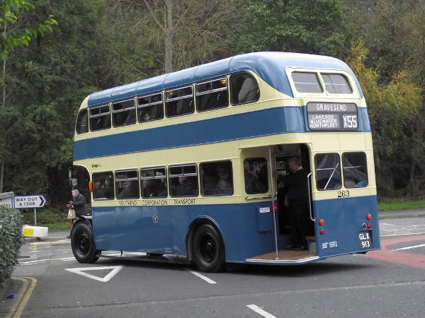Rear view of a fully laden Southend Corporation 263, GLX913.