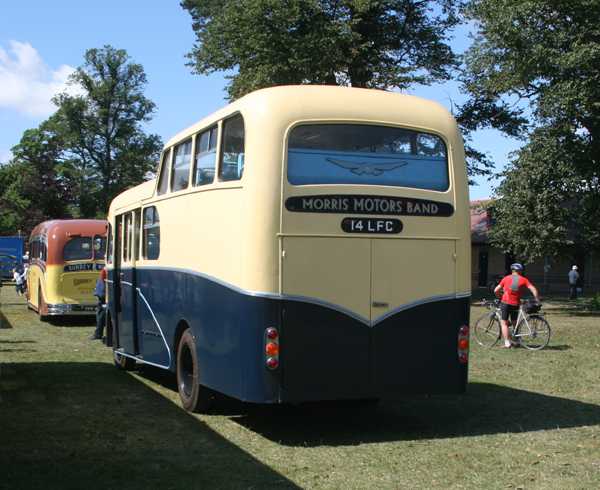 A rear view of Morris Motors Band 14LFC, a Morris Commercial FF with a Wadham RC27F body, seen at a rally at Anstey Park, Alton.