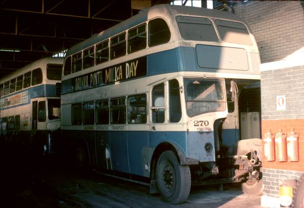 Southend Daimler CWA6 270, GYE60, started life with a Brush utility body with London Transport (numbered D71). Sold to Southend in 1954 and rebodied, it was withdrawn from passenger service in October 1963 and converted to a conductor training school (lower deck) cum uniform store (upper deck).