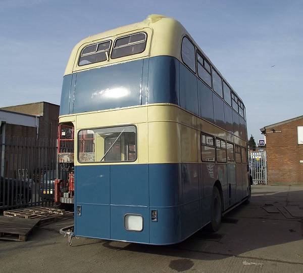 Rear view of former Southend PD3 336, CJN436C, under restoration after many years as a play bus.