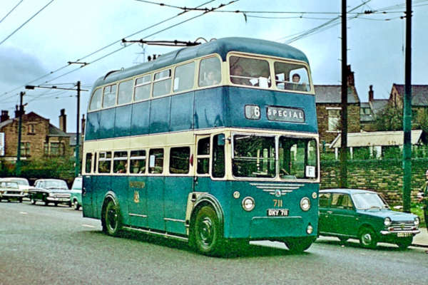 Bradford 711, DKY711, was a Karrier W dating from 1945 and rebodied with an East Lancs H37/29F body in 1960.