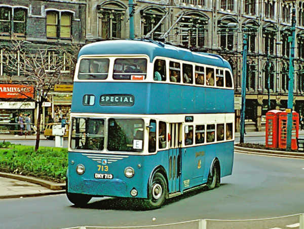 Bradford 713, DKY713, is seen here at the conclusion of Tour 6 (duty E) which was the last of the special tours on the last two days of special trolleybus operation.