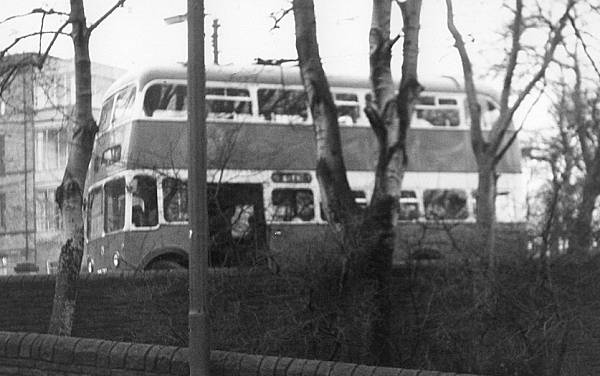 The trolleybus in the trees! An unidentified DKY series Karrier W with 1959 East Lancs. H37/28F body at the Duckworth Lane turnround, with Bradford Royal Infirmary in the background.