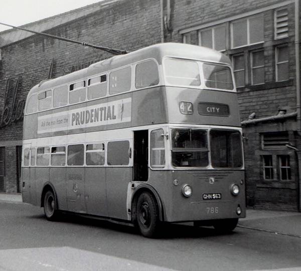 Bradford 786, GHN563, was a Karrier W4 with East Lancs H39/32F bodywork. It originated as a single-decker in Darlington with a Brush centre-entance body. New in 1944 as number 4, it survived until the final day of trolleybus operation in Darlington, Wednesday 31 July 1957. In its new guise it entered service in Bradford on 1 February 1959 and was the first of the 'Darlingtons' to be withdrawn, on 31 July 1970.