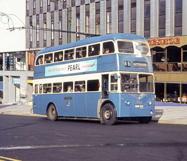 New to Darlington Corporation (21) in 1944 with a Brush B33C body, it was acquired by Bradford in 1957 and rebodied with this East Lancs. body (initially as H39/32F) in 1958. In 1965 the original Metro-Vick 85hp motors were replaced by 95hp ones acquired from Kingston-upon-Hull.