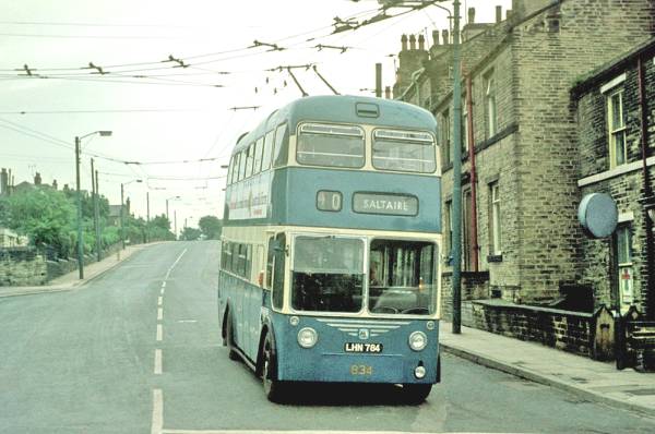 Bradford 834, former Darlington (Doncaster) LHN784, passes the Thackley short-working loop before turning left into Leeds Road en-route to Saltaire. It is now preserved at Sandtofts.