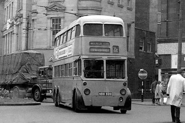 Newcastle 599, NBB 599,a BUT 9641T with MCW H40/30R body new in 1950, at the Monument in the city centre.