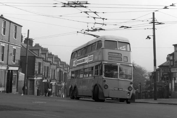 Another 1966 view from Robert shows Newcastle Corporation BUT9641T / Metro-Cammell 599, NBB599.PG Photo taken by the late Robert Jowitt, 1966, Delaval Road, Benwell, Newcastle See the Site Map for further details about copyright.