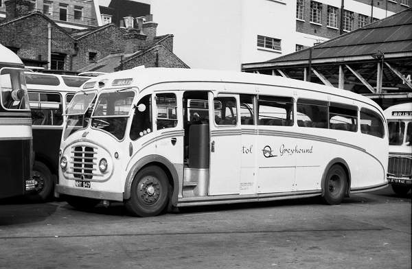 Bristol Greyhound coach 2067, NHY947, a Bristol LWL with ECW FC35F body, new in 1951, seen at Victoria Coach Station waiting to return to Bath.