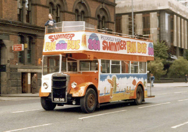 SELNEC 5995, EDB549, ex-Stockport 295, a 1951 Leyland bodied Leyland PD2/1. The Stockport tree lopper has been decorated with advertising as the Piccadilly Radio (261 on the medium wave) Summer Fun Bus for 1980.
