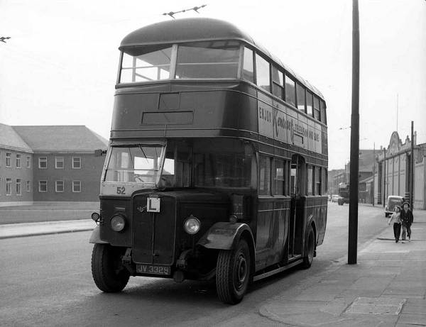On driver training duties 52, JV3329, retained its Grimsby livery when seen outside the depot. This 1935 Roe H26/22C bodied AEC Regent was withdrawn later in 1958.