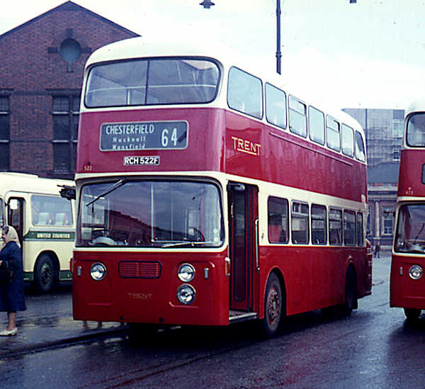 Trent, Derby 522, RCH522F was a Daimler CRG6LX Fleetline with an Alexander 'A' H44/31F body, and was seen in Huntingdon Street Bus Station in Nottingham.