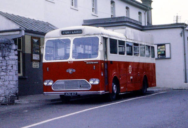 By 1971 and for a number of years, Irish Gaelic speakers were frequently able to have a monopoly of Coras Iompair Eireann destination blinds. Overseas visitors interchanging at Mallow Station from the main line or the long branch from Killarney and Tralee would have to know or ask about this Leyland Leopard L2 awaiting next duty to Port Lairge or Waterford. Framed by leaning telegraph pole and station exterior E77, AZC417, had CIE DP45F body new in July 1962.