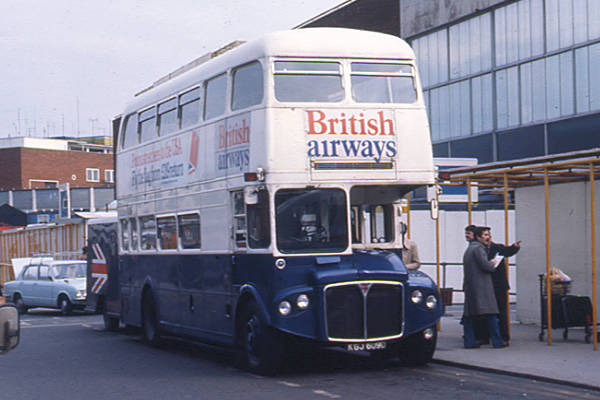British Airways KGJ609D, one of a batch of 65 AEC Routemasters with front entrance bodywork bought by British European Airways in 1966 for use on passenger transfer from central London to Heathrow.
