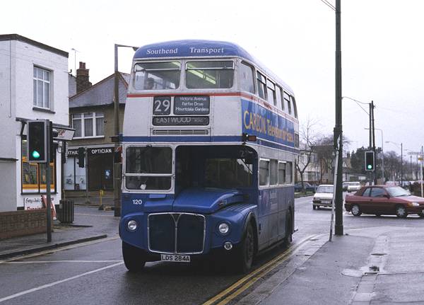 In the twilight of Southend's RM operations, 120 (the former RM546, reregistered from WLT546 to LDS284A whilst with Clydeside Buses) performs on the 29 on Christmas Eve, 1993 and passes under a street light mounted on a former trolleybus traction standard at the junction of Fairfax Drive and Southbourne Grove.