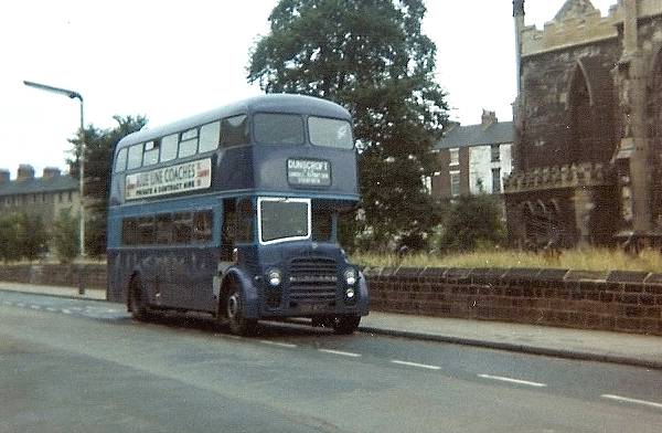 When Wallace Arnold sold its bus operations in Leeds and district to Leeds City Transport no vehicles were involved. The last buses delivered new to Kippax Motors were a pair of Leyland Titan PD3A/1s with Roe bodywork new in 1965. These went to the Blue Line company of Armthorpe near Doncaster. DUG167C stands at the Christ Church terminus in Doncaster, the home to many of the independent services in the town