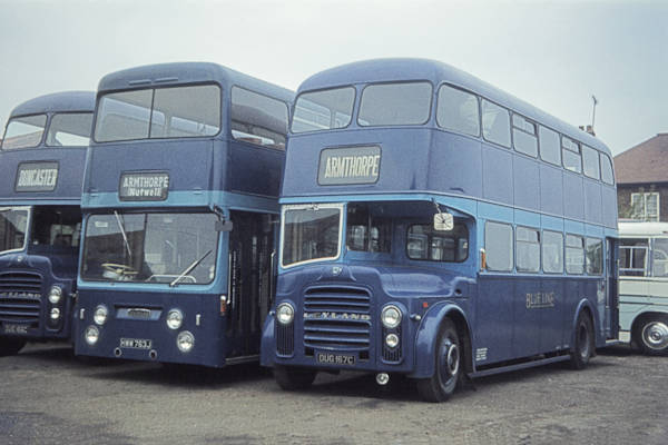 Samuel Morgan (Blue Line), Armthorpe DUG167C, a Leyland Titan PD3A/1 with Roe H42/31RD body, new to Kippax & District in 1965, and acquired by Morgan in 1968. One of a pair, the other one DUG166C is on the far left.
