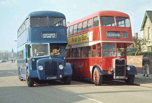 Samuel Morgan (Blue Line), Armthorpe KYG299D, a Guy Arab V (6LW) with Roe H41/32F body, new in 1966. It is passing Yorkshire Woollen District 511, GKP443, a Guy Arab II (6LW) new in 1944 to Maidstone & District (DH62) with a Weymann H30/26R utility body, but exchanged with YWD for a Daimler CWA6, then rebodied for YWD by Roe as H31/25R in 1955.