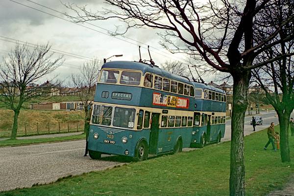 This scene was taken during the second and final Last Trolleybus Weekend tour of the remaining routes, following the withdrawal of scheduled services two days earlier. Eight trolleybuses were required to handle the demand from enthusiasts and local residents. The £1 fare was excellent value, as the vehicles made numerous photo stops en-route.