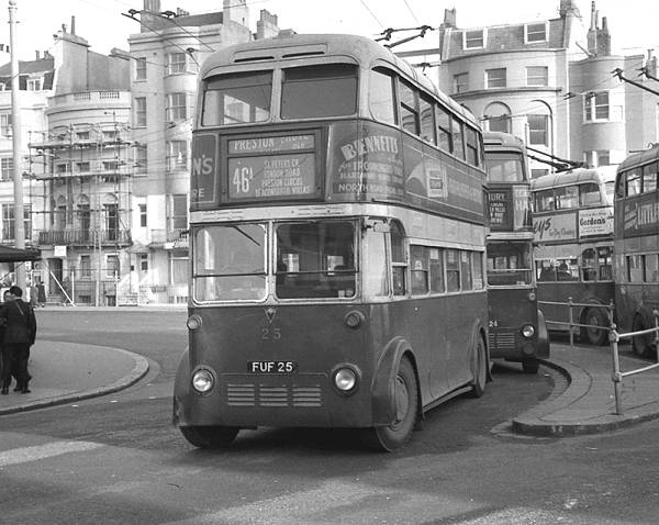 An A.E.C. line up at Old Steine headed by Brighton Corporation 25, FUF25, one of the forty-four A.E.C. 661Ts with Weymann H30/24R bodies new in 1939.