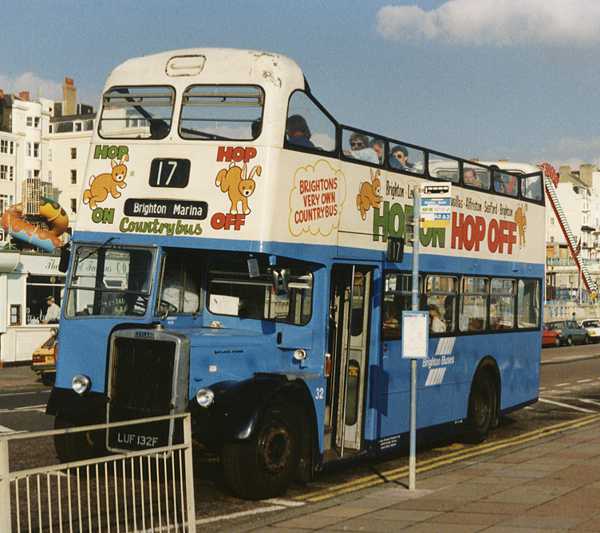 Brighton Buses 32, LUF132F, a Leyland PD3/4 with MCW O39/30F body, new to Brighton Corporation in 1968 as H39/30F, rebuilt to open top in 1979.