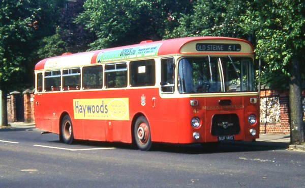 Brighton Leyland Panther Cub 41, NUF141G, in red and cream during the change over to blue/white.