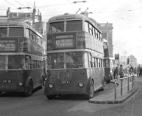 Two of the Brighton Corporation A.E.C. 661Ts new in 1939 with Weymann H30/24R bodies, 30 and 42, FUF30 and FUF42, seen at the terminus at Old Steine.