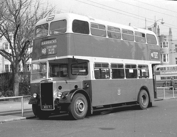 Seen at Old Steine in Brighton is a very new looking Brighton 71, WCD71, a Leyland PD2/37 with a Weymann H33/28R body, one of twenty that entered service in 1959.