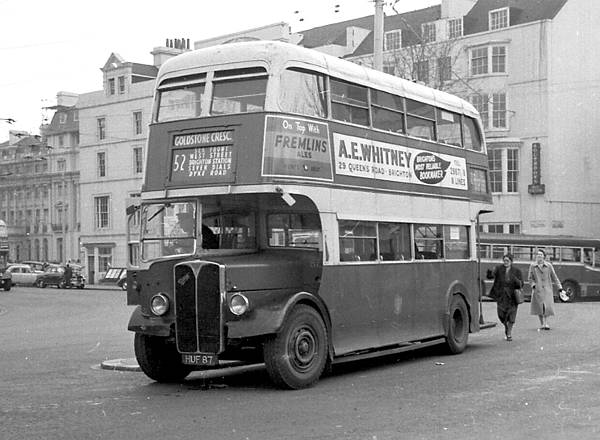 Brighton 87, HUF87, was an A.E.C. 0961 Regent III with a Weymann H30/26R body, one of eight new in 1947, seen at Old Steine in Brighton.